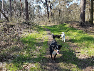 Een half uur vermaken we ons in een verscholen hoekje van het terras dat de zon je-ziet-me-wel-je-ziet-me-niet belichtte. Ik met een spring-in-het-veld, Pop dromend van het eindelijk gespotte parkkonijn waarvan ze hoopt dat we daar zo dadelijk naar terugkeren. No way José. De andere uithoek van het terras bemant een groepje bebrilde mannen met een uit de kluiten gewassen zwarte gedreadlockte hond. Ze spreken een taal die Scandinavisch aanhoort. Bij het verlaten van het terras moeten we erlangs. Moi: 'May I ask which language you speak?' Pop schrikt van de hond die ze nog niet ontdekt had en aanblaft. Een van hen antwoordt: 'Norsk. We are nordmenn.' Moi: 'That explains her bark, my dog only understands Dutch and Swedish.'